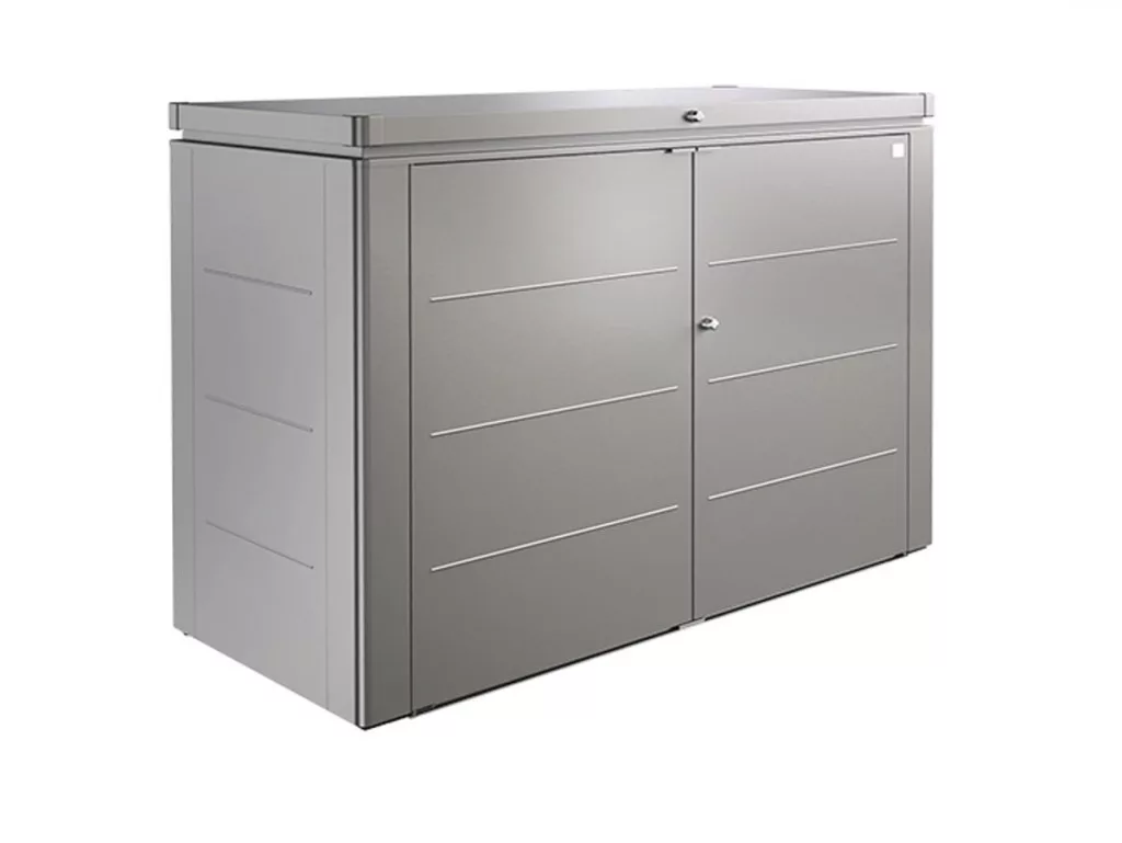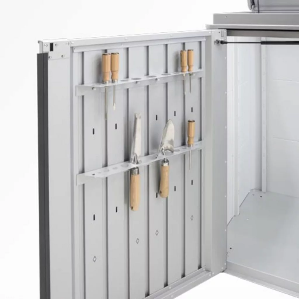A Biohort HighBoard® egy multifunkcionális prémium kerti tárolószekrény, amely ideális megoldást kínál kültéri tárolási problémákra. A praktikus kialakítás lehetővé teszi a nagyobb eszközök vagy szemeteskukák egyszerű tárolását, miközben a tároló esztétikusan illeszkedik a kert vagy a terasz környezetéhez.