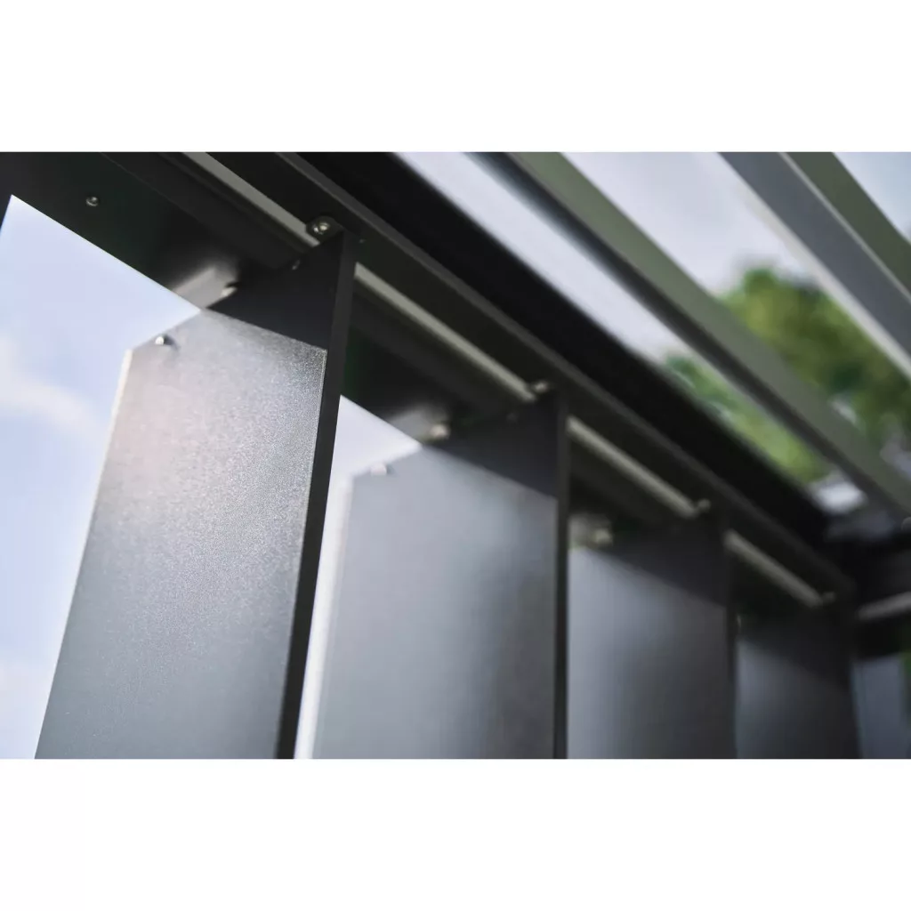 A 130°-ban állítható lamellák biztosítják az optimális komfortot, miközben a szendvicsszerkezetű kialakítás csökkenti a hőterhelést és a zajszintet. Az integrált vízelvezető rendszer gondoskodik az esővíz diszkrét elvezetéséről, így rossz időben is használható marad a pergola.
