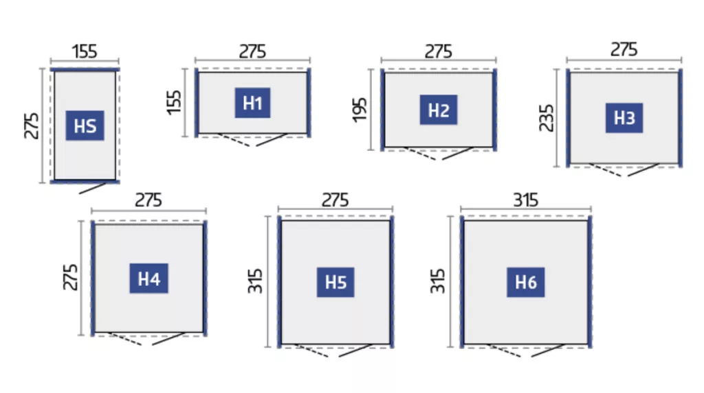 Elérhető méretek: több méretváltozat (HS, H1–H6), kb. 3,3 m²–9,8 m² alapterületig.