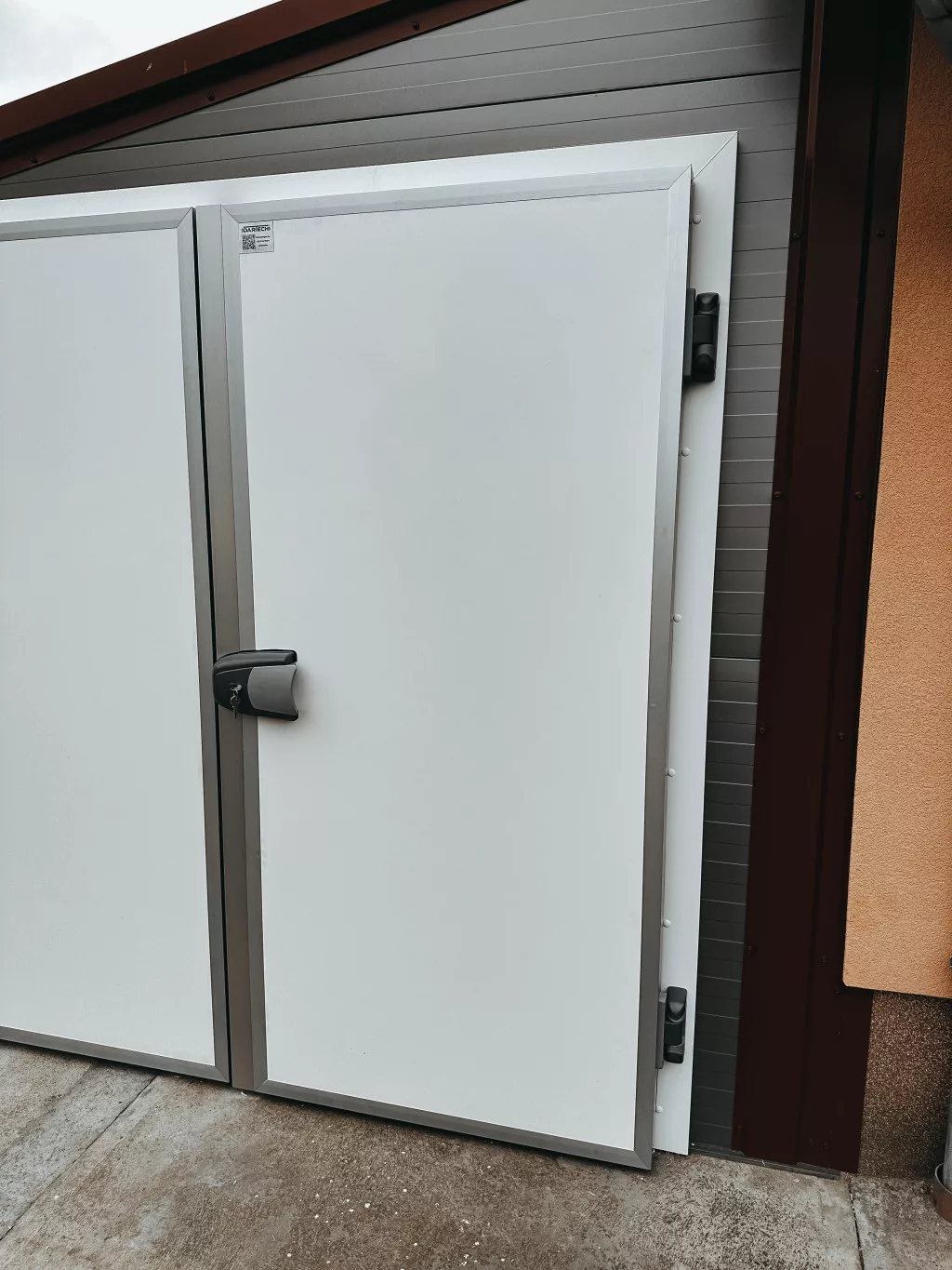 A 1100 × 2500 mm-es nyíló hűtőkamra ajtó, kívülről takaró tokszerkezettel, fokozott hőszigetelési teljesítménnyel rendelkezik a 80 mm vastagságú polisztirol mag révén. A PVC burkolat és eloxált alumínium élvédelem élelmiszeripari felhasználásra is alkalmassá teszik. A külső tokszerkezet biztosítja, hogy a teljes ajtónyílás átjárható maradjon. Kiemelő zsanérjai és állítható zárszerkezete garantálják a könnyű szerelést és tökéletes záródást. A belső fluoreszkáló kilincs és a vészkengedő funkció fokozzák a biztonságot.