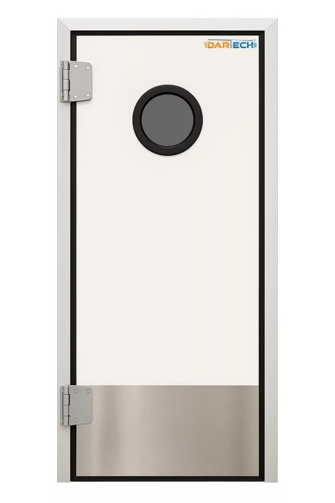 Ez a kiváló minőségű lengőajtó ideális választás ipari, élelmiszeripari vagy nagyforgalmú közösségi terek számára, ahol elengedhetetlen a gyors, kényelmes és biztonságos átjárás. A termék alap kivitelben 900 × 2100 mm-es beépítési nyílás lefedésére alkalmas, de igény szerint egyedi méretben is rendelhető, így tökéletesen alkalmazkodik a helyszíni adottságokhoz.