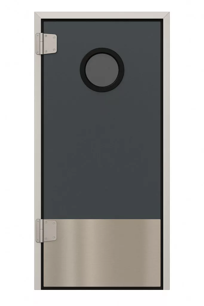 Az ajtólap két oldalt szürke színű stadurlapból áll, szélein alumínium keretprofillal, mely lehetővé teszi az oldalsó gumitömítés elhelyezését a megfelelő záródás érdekében. A zsanérok lehetővé teszik az ajtó mindkét irányból történő nyitását, és 90º -ban történő kitámasztását, ezzel könnyítve az átjárhatóságot. A műanyag borítású acél rugós zsanérok alkalmasak élelmiszeripari használatra is. Az ajtó az áthaladás után visszazáródik mindenféle kézmozdulat nélkül.