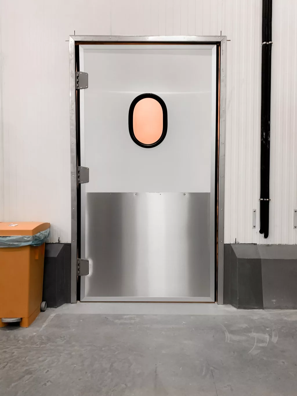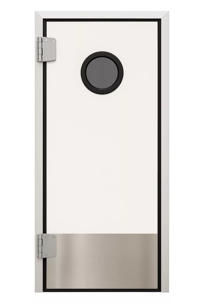 Az ajtólap két oldalt fehér színű stadurlapból áll, szélein alumínium keretprofillal, mely lehetővé teszi az oldalsó gumitömítés elhelyezését a megfelelő záródás érdekében. A zsanérok lehetővé teszik az ajtó mindkét irányból történő nyitását, és 90º -ban történő kitámasztását, ezzel könnyítve az átjárhatóságot. A műanyag borítású acél rugós zsanérok alkalmasak élelmiszeripari használatra is. Az ajtó az áthaladás után visszazáródik mindenféle kézmozdulat nélkül.